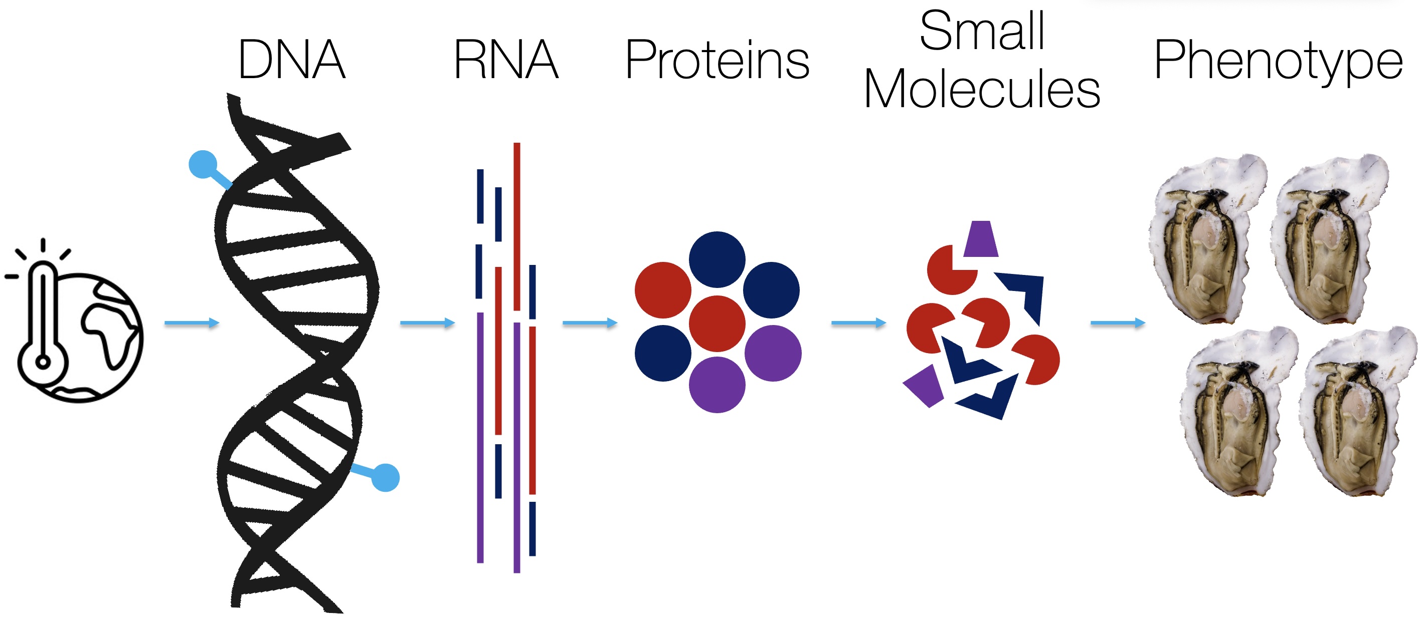 At the MMEP Lab, we apply this contextual, or mechanistic, thinking to understanding how and why marine invertebrates (ex. oysters, green crabs) respond the way they do to climate related-stressors. To understand mechanisms underpinning responses, we examine how changes in environmental conditions impact processes scaling up from molecular pathways to observable characteristics, or phenotype. Through this integrative approach, we can identify responses that are phenotypically plastic, giving us an insight into both mechanisms of resilience and susceptibility to environmental change. Much of our work involves live animal experiments, followed by lab work and bioinformatic analysis.